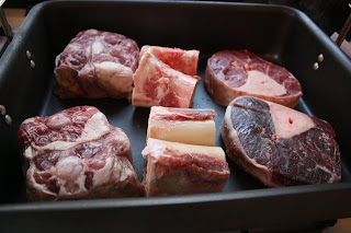 I started with 8 lb. of bones and meat: 4 lb. of oxtails on the left, 2 lb. of beef marrow bones in the middle, and 2 lb. of beef shanks on the right.