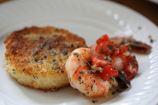 The catfish strips from the other day inspired me to make another southern-inspired dish. I had entered an idea for a different take on shrimp and grits in that contest using California Olive Ranch and Bob's Red Mill products. I had come across this delicious-looking recipe from Food & Wine for shrimp marinated in lemon and olive oil that I thought would be nice with cheese grits cakes.